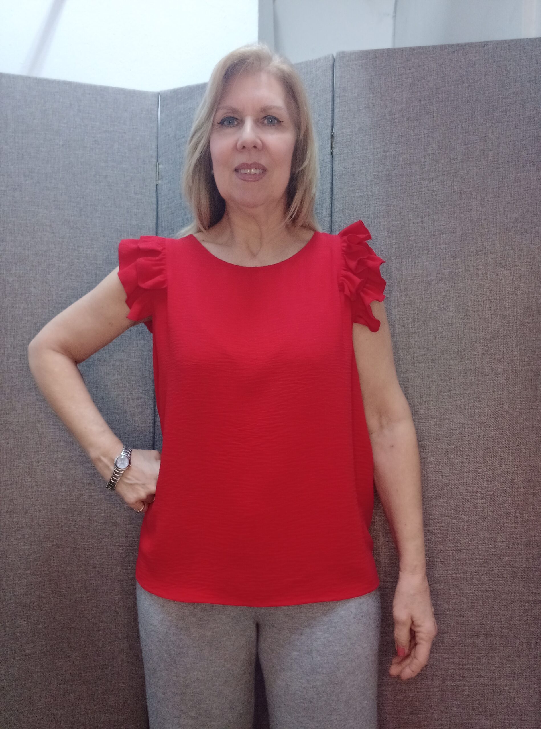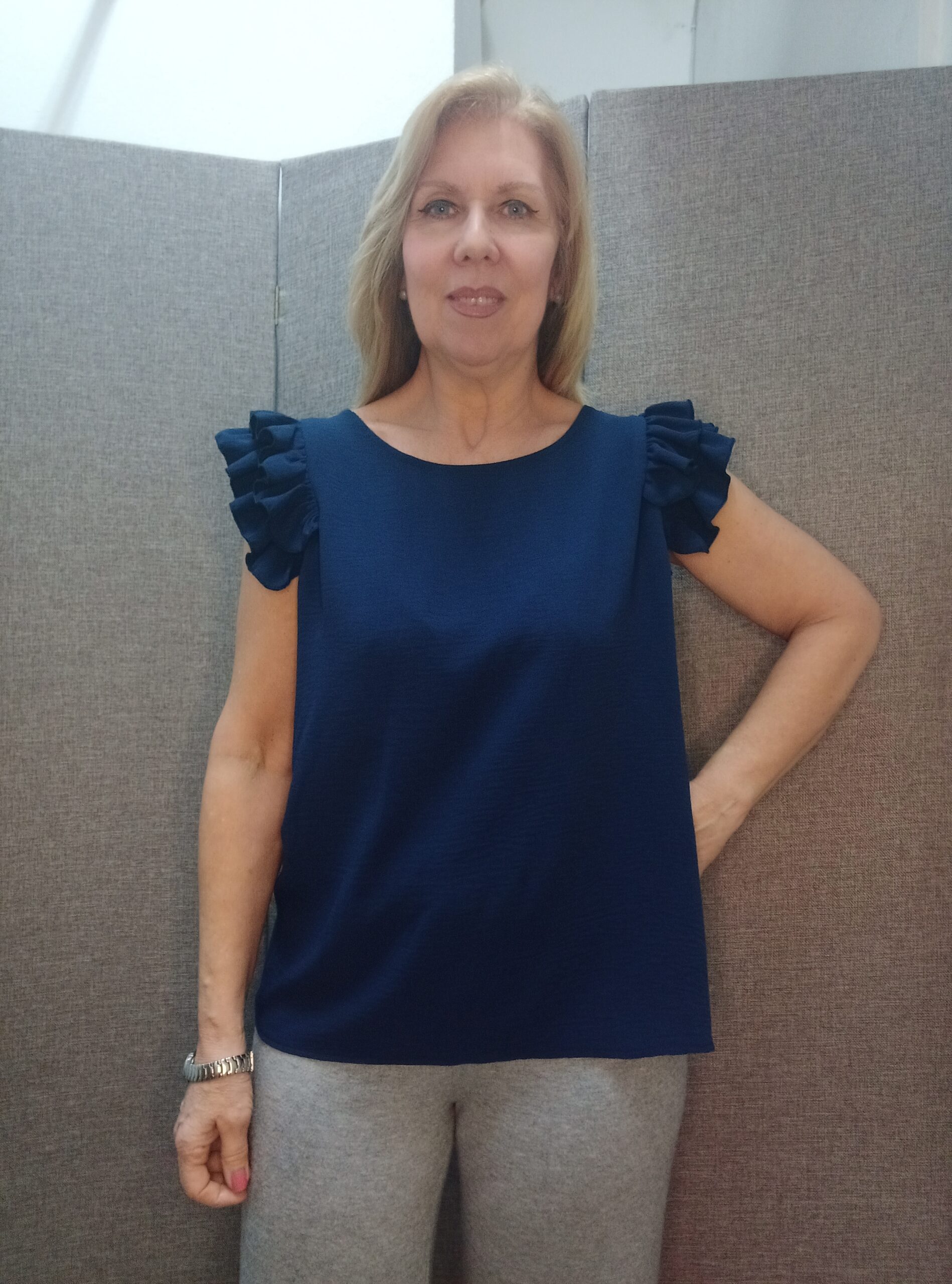 Blusa manga corta con doble volante en las mangas, cuello redondo. Dos colores,: azul marino y rojo