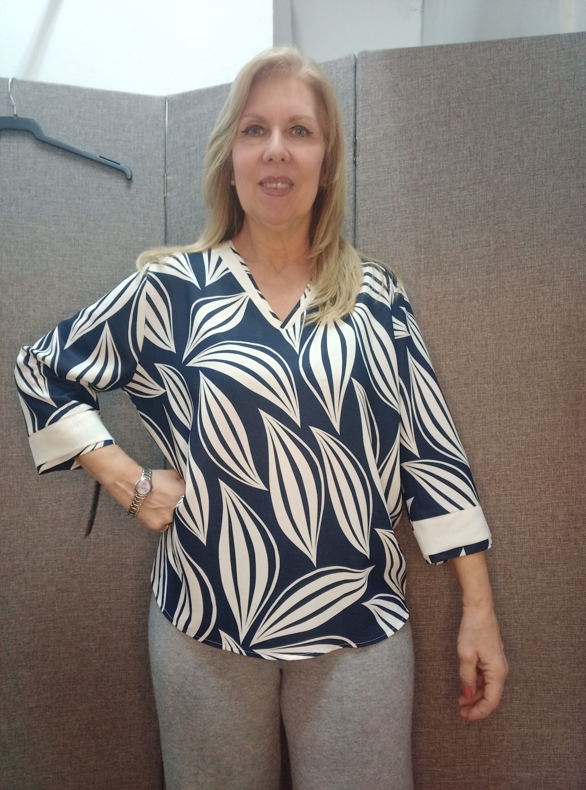 Blusa manga tres cuartos y cuello en pico con fondo azul marino y hojas en color blanco, con una franja blanca en las mangas y en el cuello de adorno.
