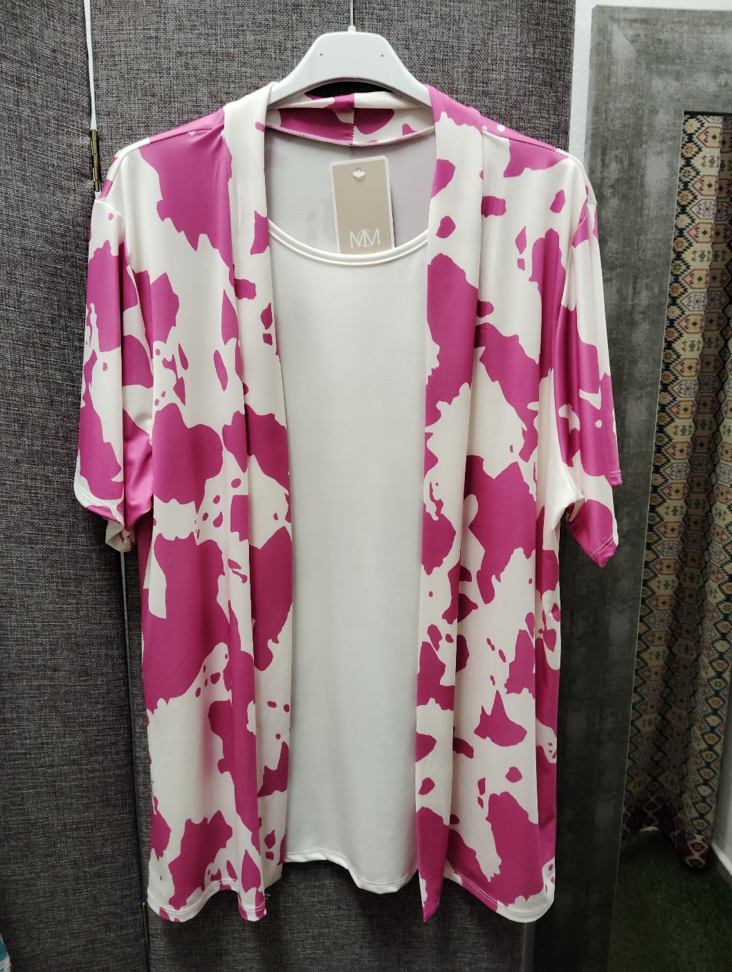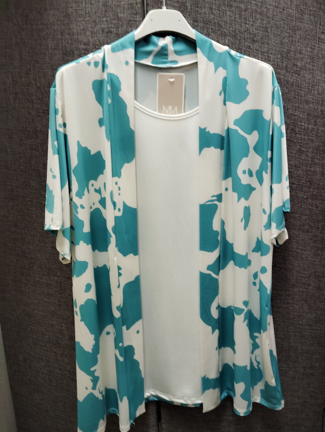 Camiseta de licra fria efecto doble con camiseta interior color blanco y chaqueta unida a la camiseta estampada animal print de vaca colores fucsia y azul aguamarina talla L-XL