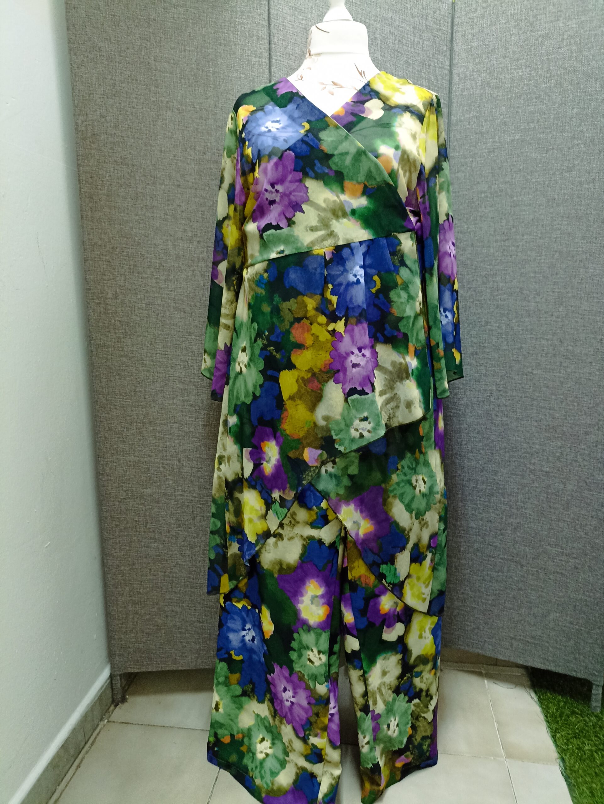 Conjunto de pantalon tipo Palazo con goma ancha en la cintura  y castan cruzado  en gasa,  mas corto por delante y mas largo por detras , estampado en colores verde claro, verde oscuro, morado, lila, amarillo y naranja.