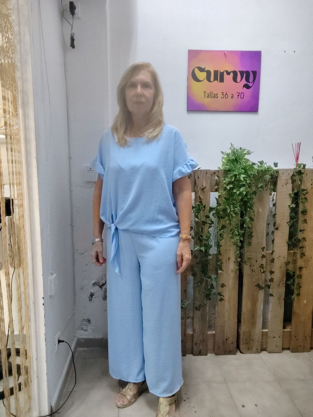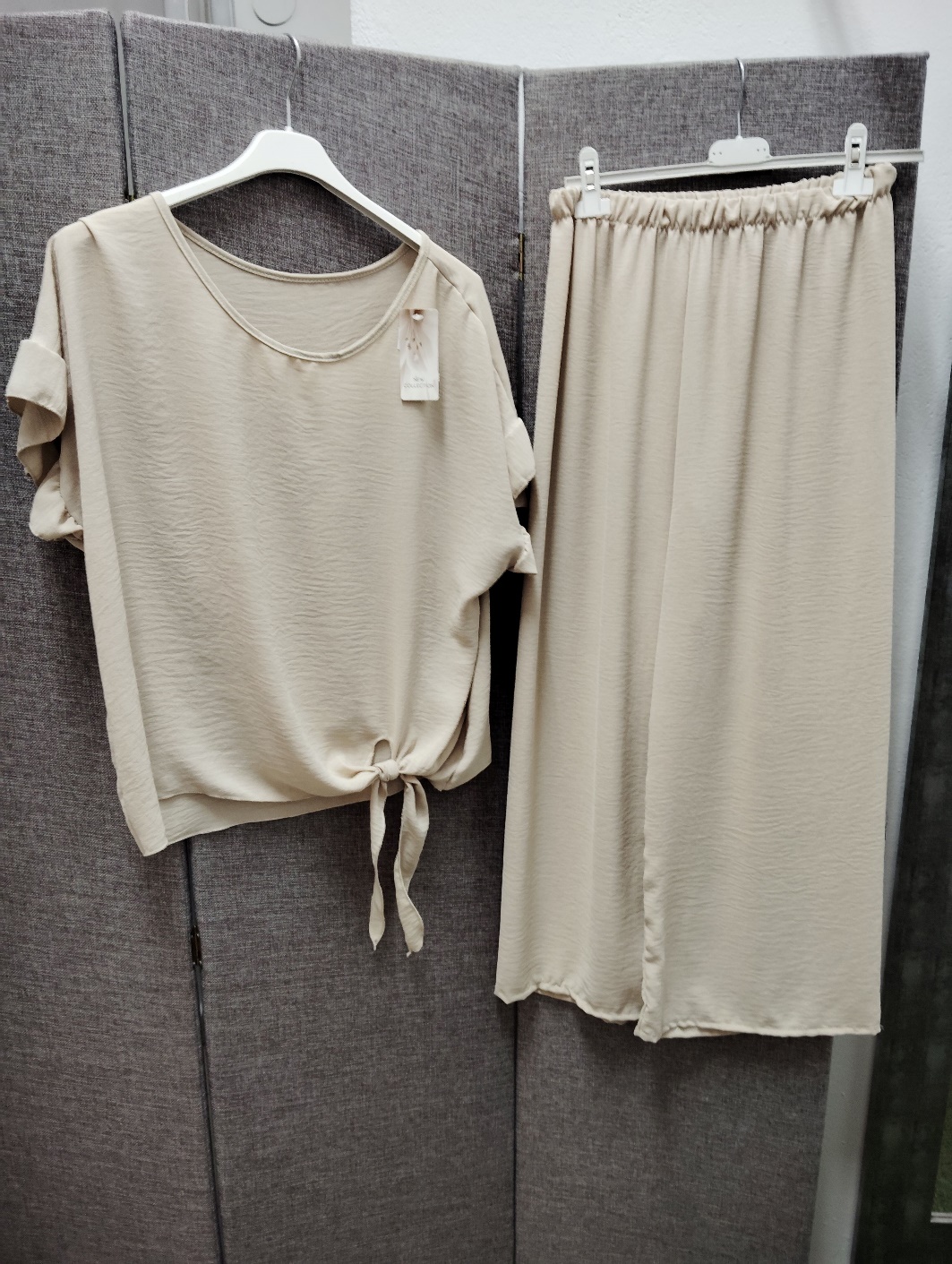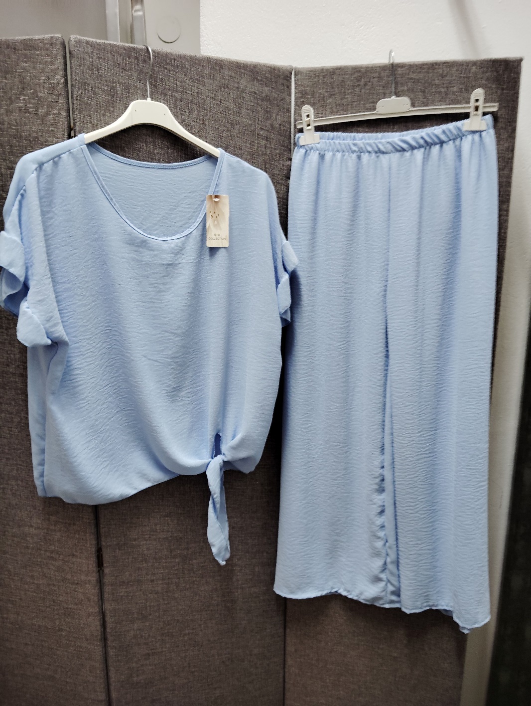 Conjunto de blusa con nudo delantero lateral con pantalon de goma en la cintura y pata ancha de viscosa efecto bambula super fresquito