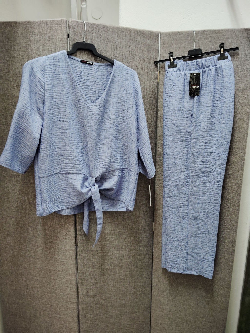 Conjunto blusa y pantalon viscosa efecto bambula. blusa con lazo en la parte delantera cuello pico y pantalon con goma en la cintura disponibles talla L y talla XL