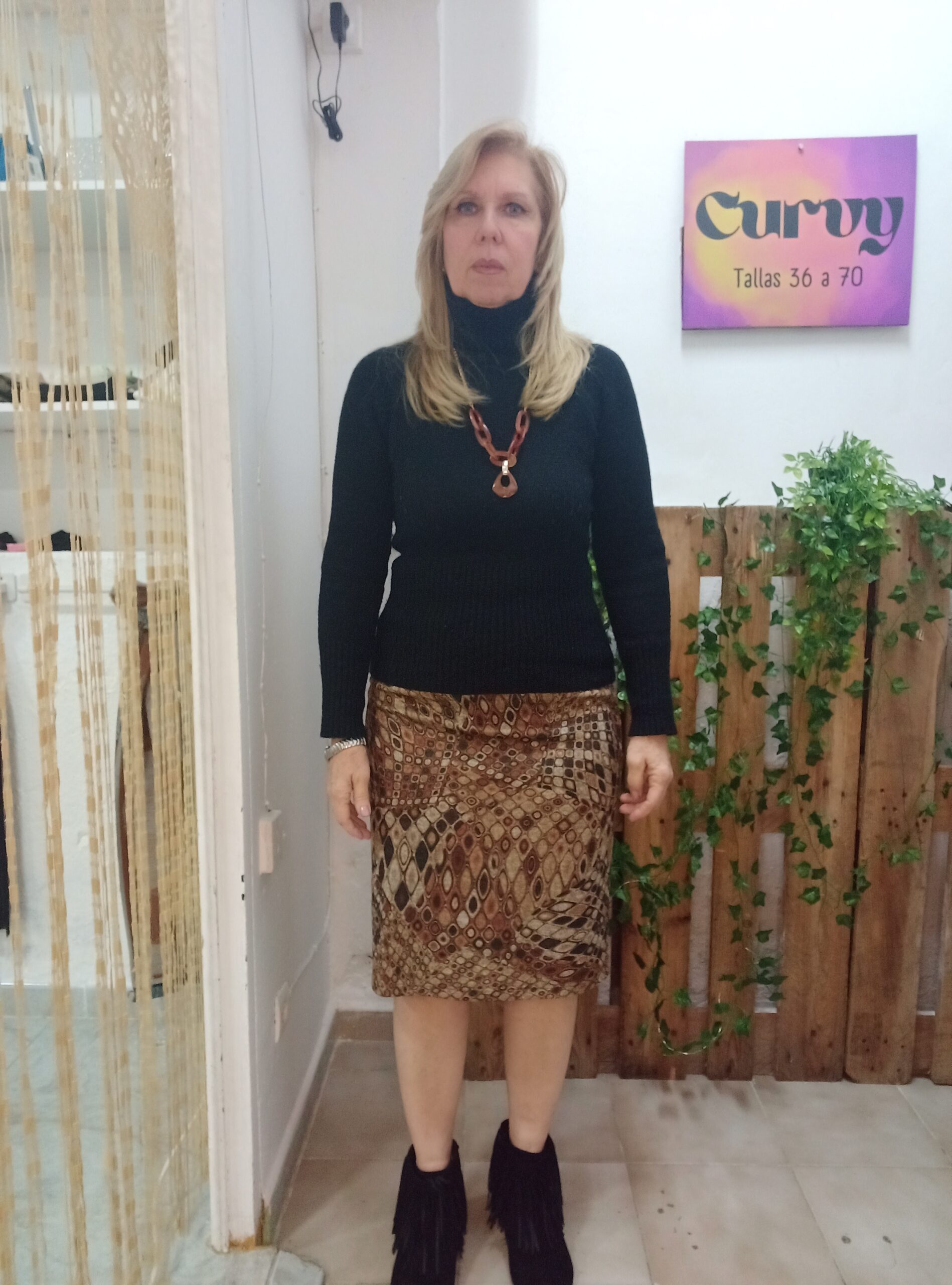Falda de paño con forro, a media pierna con estampados en tonos marrones y ocres