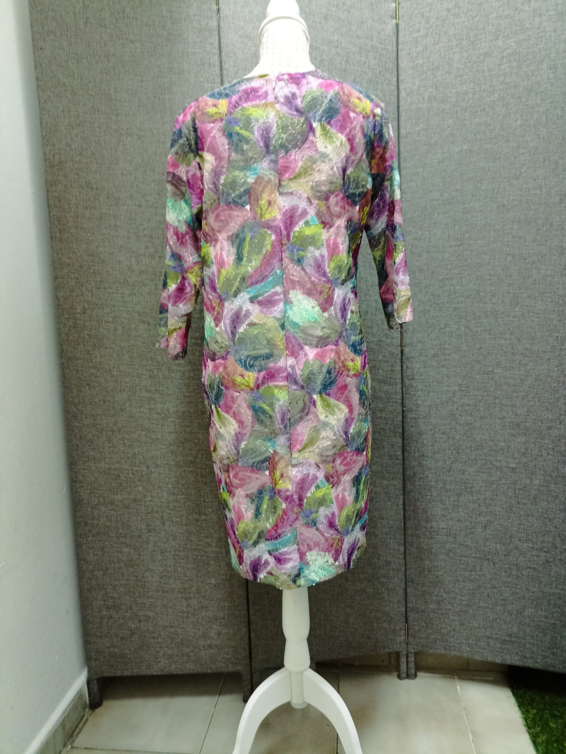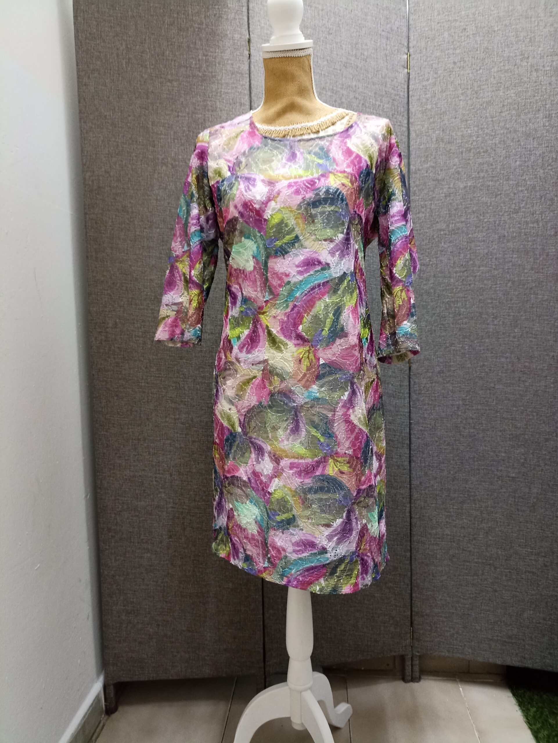 Vestido con forro interior, manga tres cuartos , cuello redondo, estampado en colores rosa, verde manzana, verde oliva, verde agua, lila y blanco.