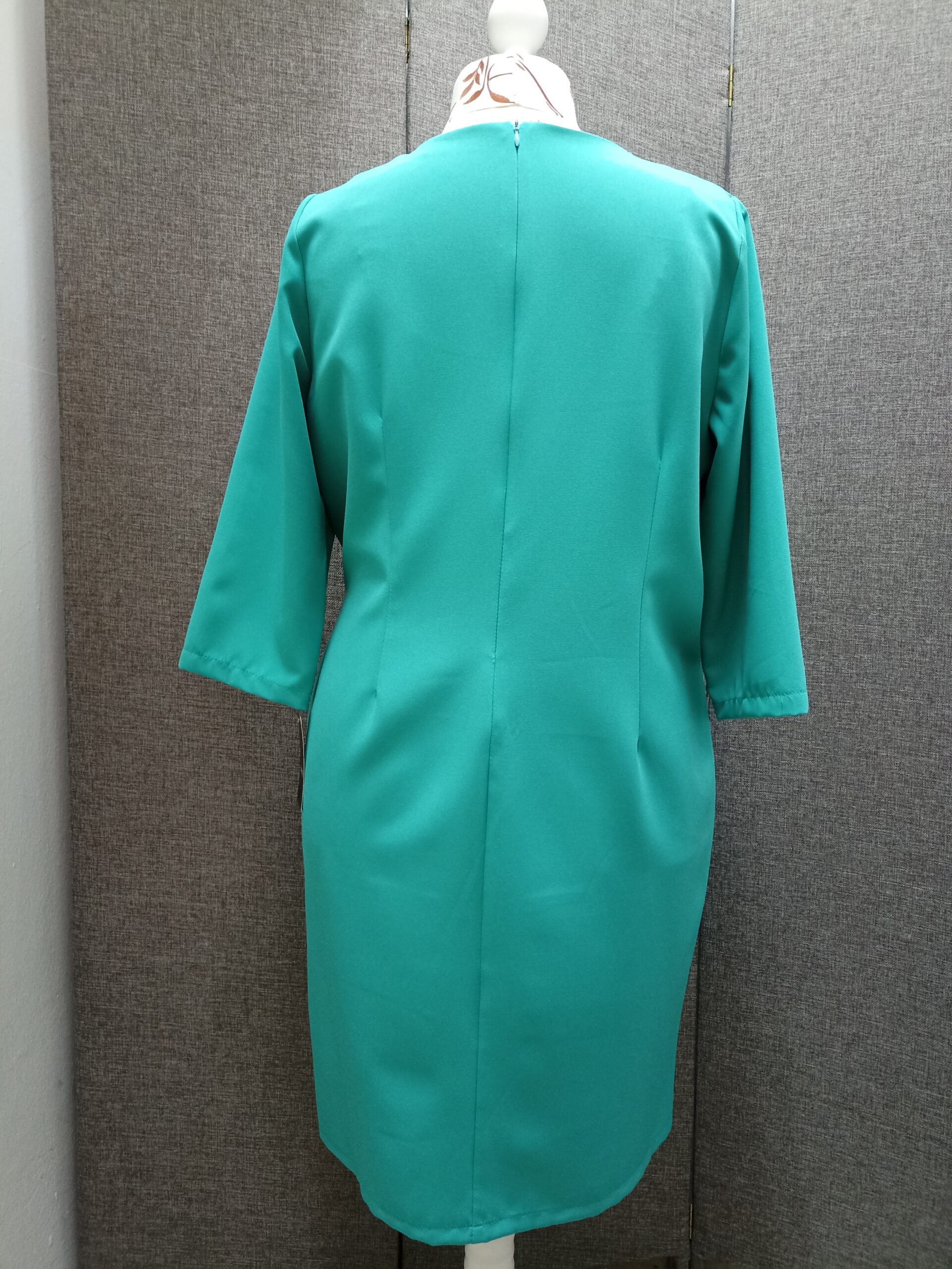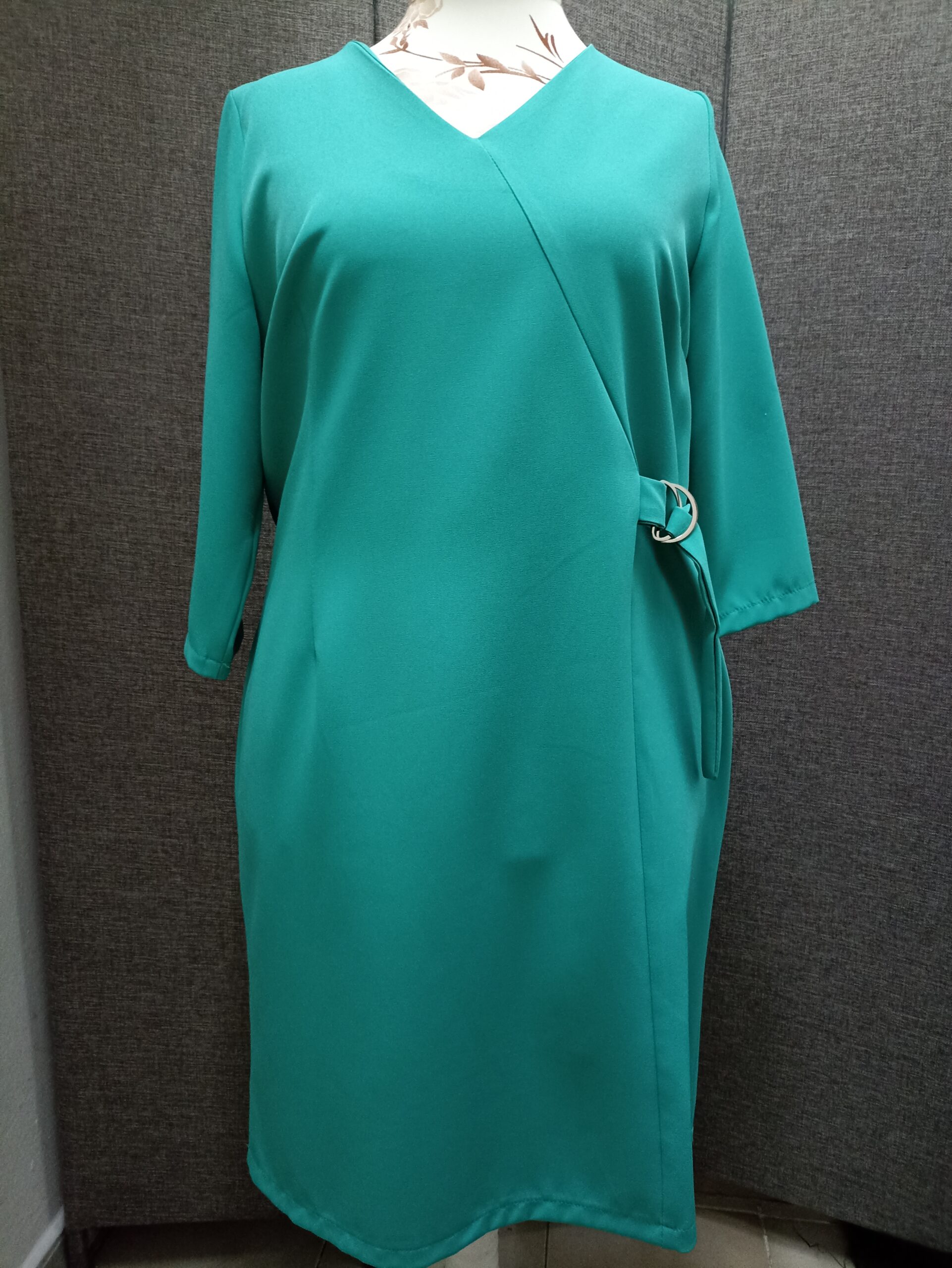 Vestido manga tres cuartos con tira con hebilla a un costado haciendo un frunce en la cintura, cuello en pico color verde agua.