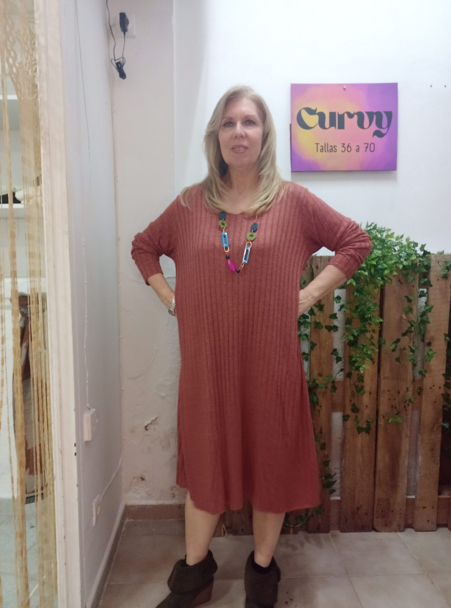 Vestido en punto con canale manga larga, cuello en pico, talla unica colores verde y teja