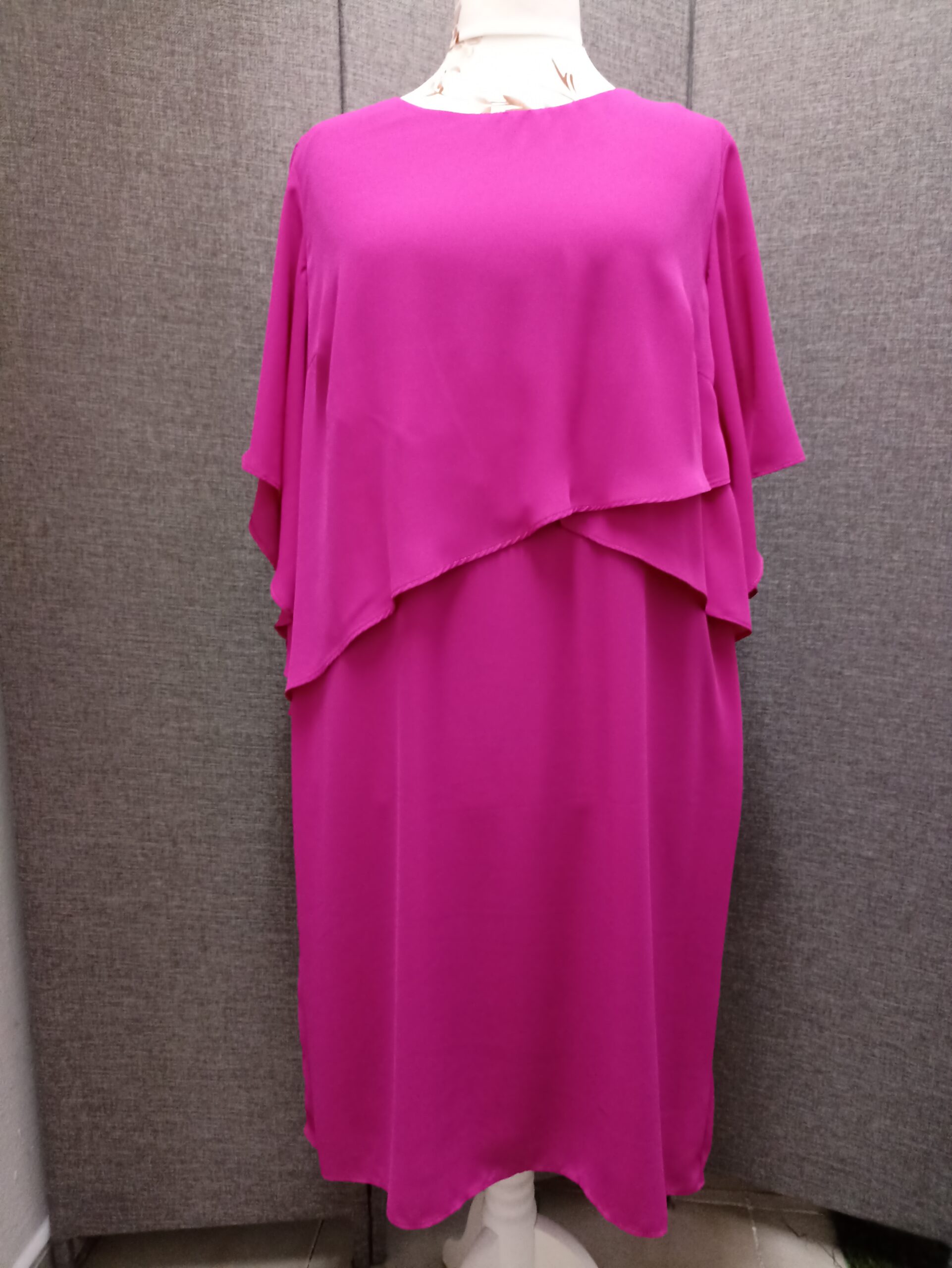 Vestido con forro elastico, mangas cortas en gasa, con doble capa en la parte delantera, cuello redondo, color fuxia.
